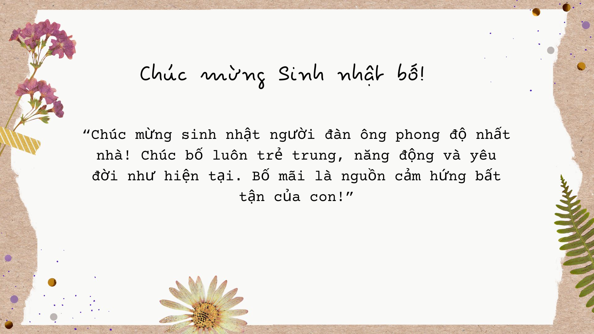 “Chúc mừng sinh nhật người đàn ông phong độ nhất nhà! Chúc bố luôn trẻ trung, năng động và yêu đời như hiện tại. Bố mãi là nguồn cảm hứng bất tận của con!”