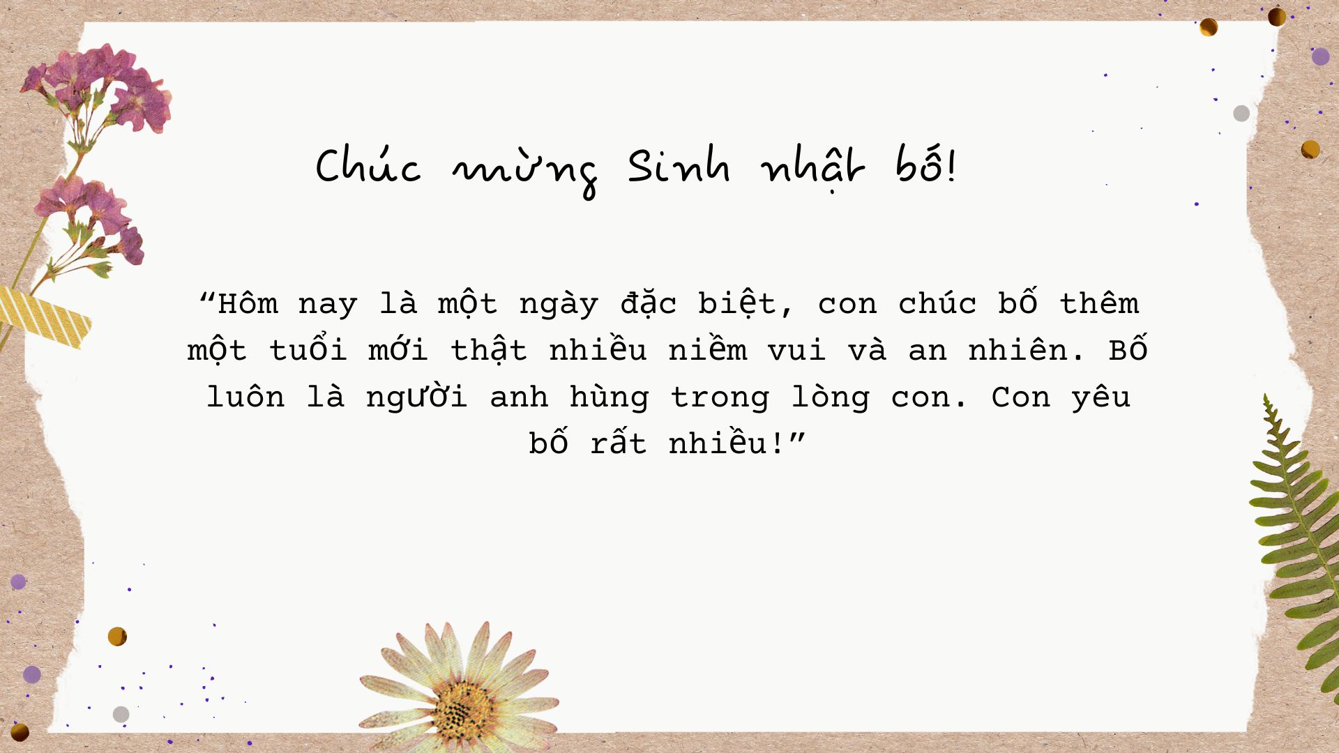 “Chúc mừng sinh nhật bố yêu quý! Con mong bố luôn khỏe mạnh, hạnh phúc và mãi là người cha tuyệt vời nhất của con. Cảm ơn bố vì tất cả những gì bố đã làm cho gia đình mình.”