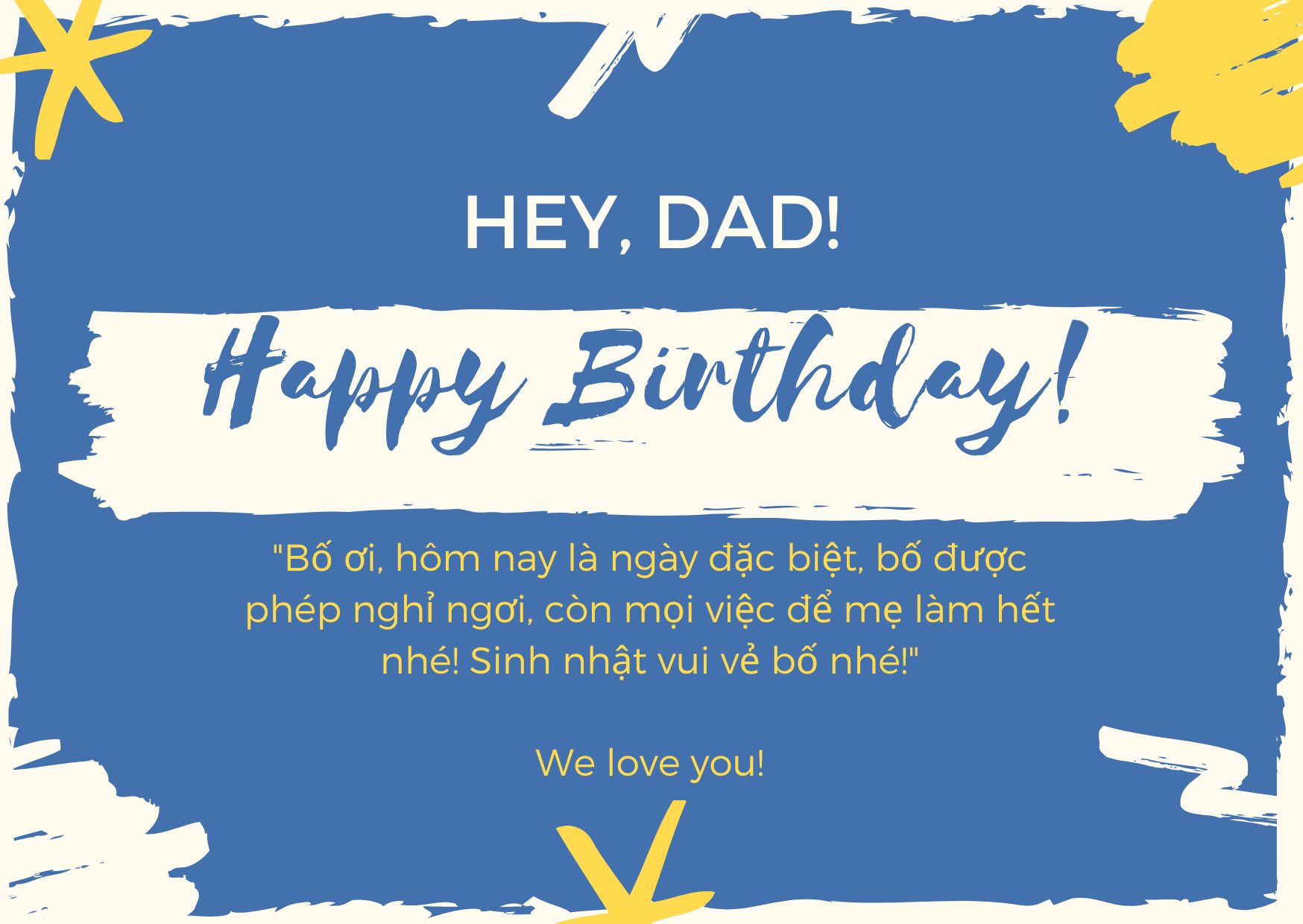 "Bố ơi, hôm nay là ngày đặc biệt, bố được phép nghỉ ngơi, còn mọi việc để mẹ làm hết nhé! Sinh nhật vui vẻ bố nhé!"