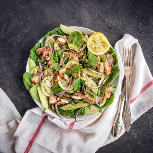 Trưa: ½ chén cơm, 200 gam salad gà, một ít hạt