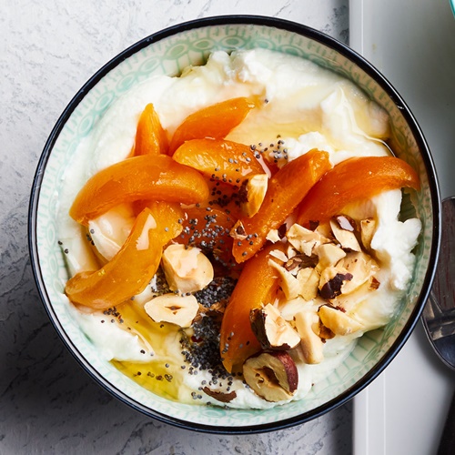 Bữa tối: một hộp sữa chua không đường, hoa quả tươi.