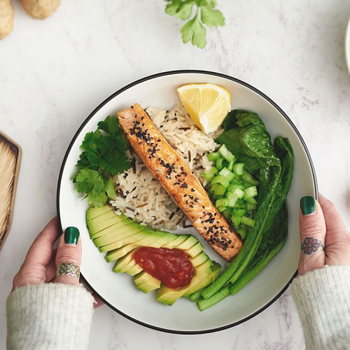 Buổi tối: 1 phần cá hồi + 1 ít măng tây + 1 ít bơ.