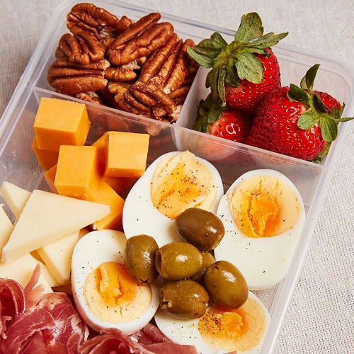 Buổi trưa: 1 phần giăm bông + 1 ít phomai thái lát + 1 ít loại hạt khác nhau.